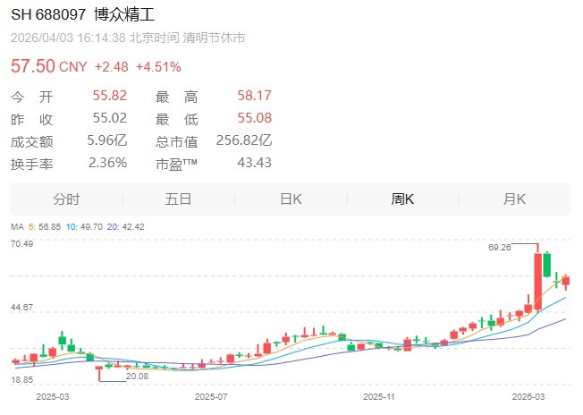 股价方面,截至4月3日收盘,博众精工报57.5元/股,最新市值257亿元。