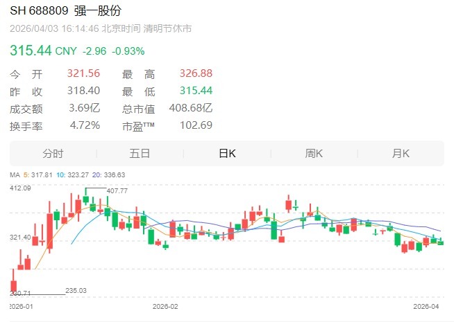股价方面,截至4月3日收盘,强一股份报315.44元/股,最新市值409亿元。