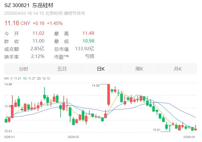 股价方面,截至4月3日收盘,东岳硅材报11.16元/股,最新市值134亿元。